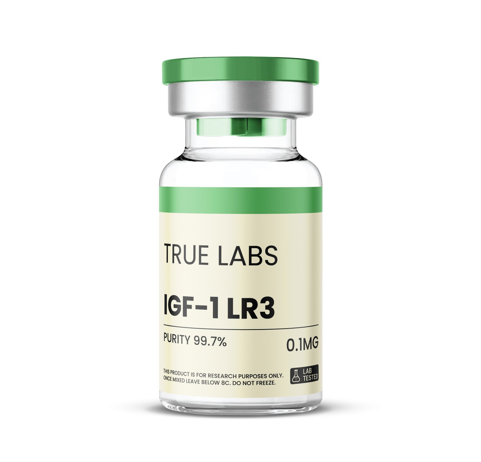 IGF-1 LR3 0.1mg synthetic peptide supplied as a lyophilised formulation. Manufactured to high purity standards and laboratory tested for identity and consistency. Intended for laboratory and analytical research use only.